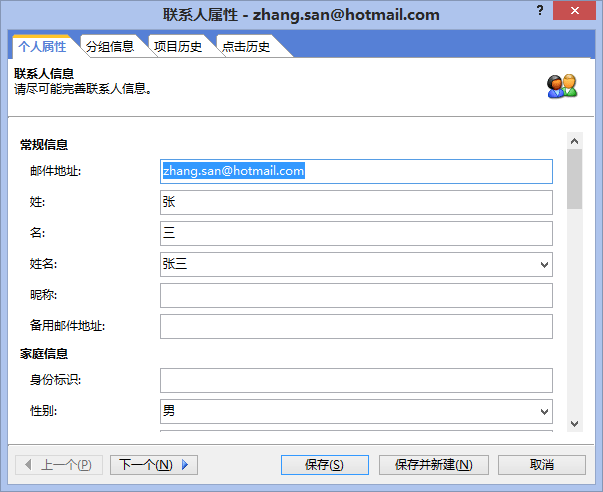 注意:为了保证此联系人信息可用,您至少需要输入联系人的电子邮件地址信息。