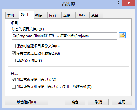 项目文件的默认保存位置,缺省为C:\Program Files\Email Marketer\Projects。