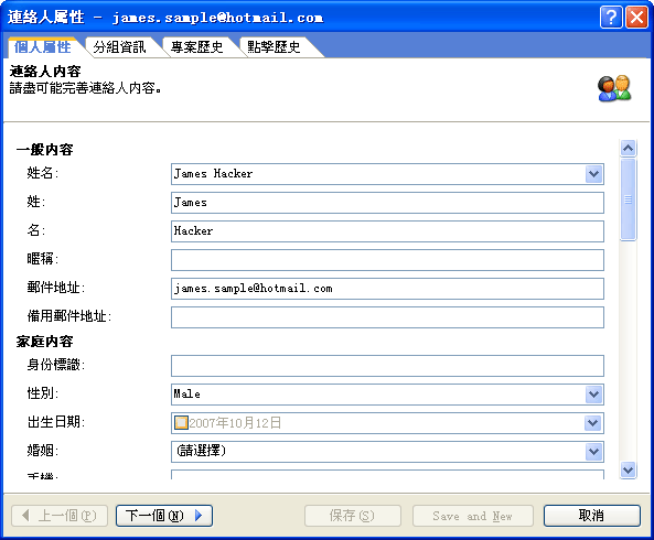 注意:為了保證此聯系人信息可用,您至少需要輸入聯系人的電子郵件地址信息。