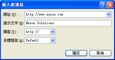 超級鏈接的協議類型,例如您可以在網址中輸入"support@nesox.com",然後再選擇"mailto:"鏈接類型。