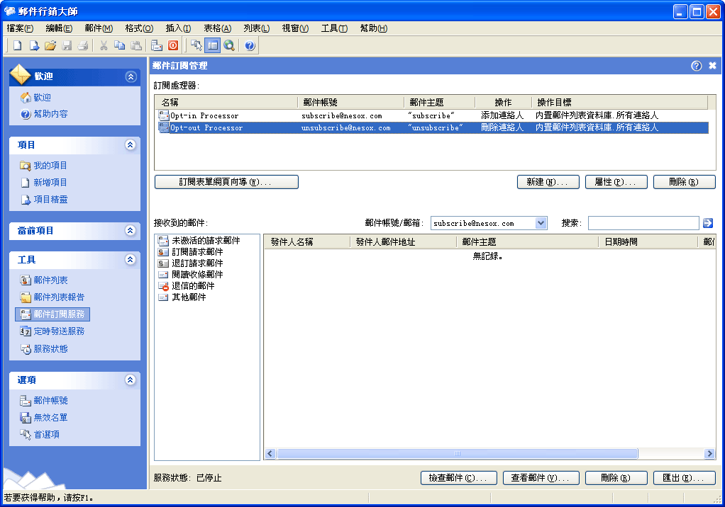 郵件營銷大師商業版的郵件訂閱服務可以幫助您創建和定義郵件處理規則,自動監控郵件列表的訂閱和退訂請求郵件並自動更新郵件列表數據庫。另外,它還能幫助您創建訂閱表單網頁,支持在線訂閱。