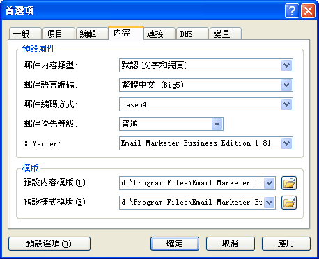 郵件內容類型 默認的郵件格式,您可以選擇純文本、網頁或者兩者兼有。